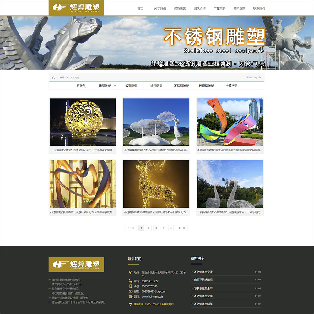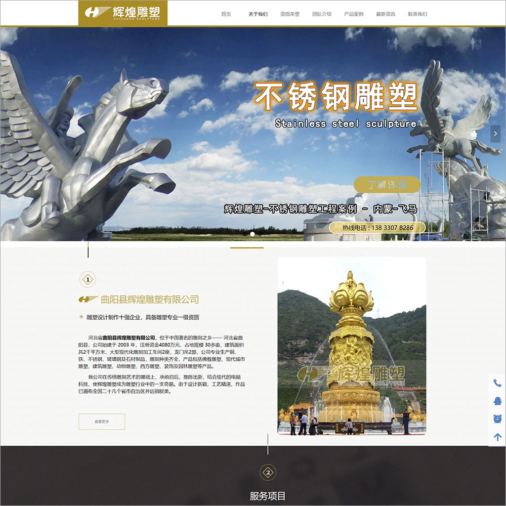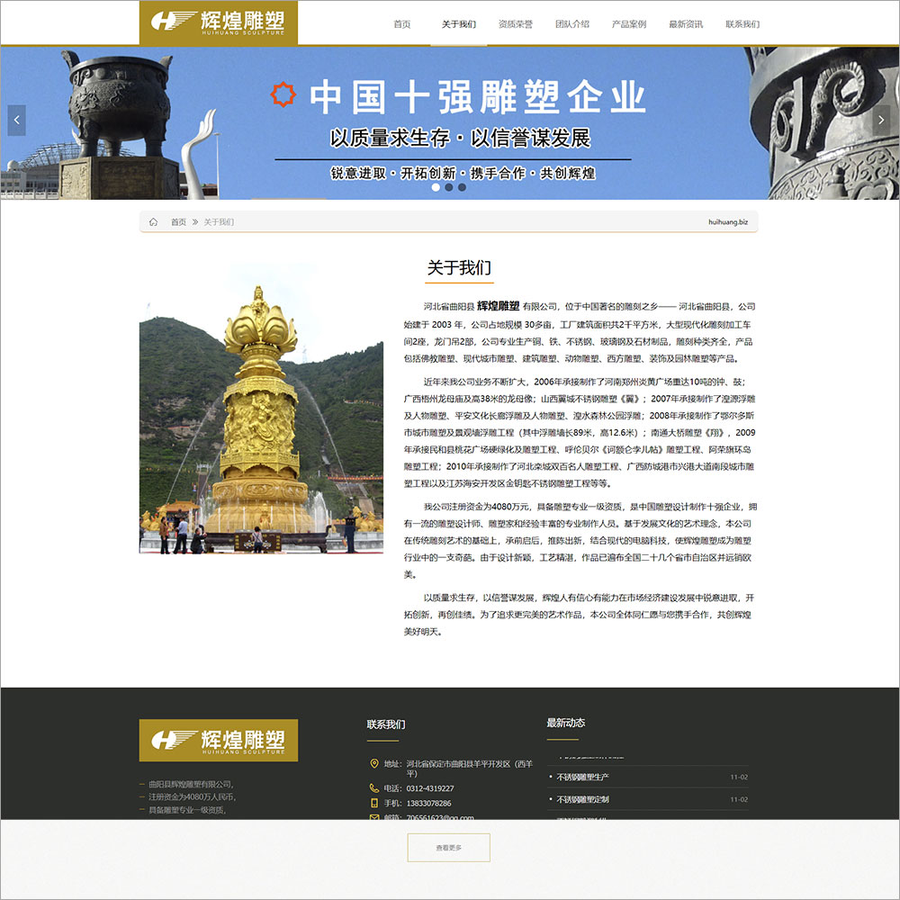 曲阳县辉煌雕塑有限公司 生产铜、铁、不锈钢、玻璃钢及石材制品,雕刻种类齐全,产品包括佛教雕塑、现代城市雕塑、建筑雕塑、动物雕塑、西方雕塑、装饰及园林雕塑等产品。